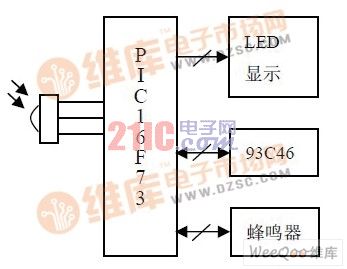 紅外發(fā)射部分電路框圖如圖1所示,主要由單片機(jī)PIC16F73及外部電路構(gòu)成。PIC16F73 單片機(jī)是由美國(guó)Microchip公司生產(chǎn)的8位單片機(jī),采用Harvard結(jié)構(gòu),這種結(jié)構(gòu)使指令執(zhí)行和取指操作可重疊進(jìn)行,從而達(dá)到很高的執(zhí)行速度。它只有35條單字節(jié)指令,除了跳轉(zhuǎn)指令是2周期指令外,其它指令都是單周期指令。相對(duì)于其它的8位單片機(jī)節(jié)省了1/2的程序空間,并具有四:1的速度優(yōu)勢(shì)。