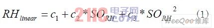 溫濕度數(shù)據(jù)處理程序主要包括對(duì)濕度值和溫度值的計(jì)算、檢測(cè)、對(duì)結(jié)果進(jìn)行線性補(bǔ)償?shù)取HT75的相對(duì)濕度數(shù)字輸出特性曲線如圖3所示,由圖3可以看出,濕度輸出特性呈一定的非線性,因而要采用公式(1)進(jìn)行修正,其中SORH 為傳感器相對(duì)濕度測(cè)量值,各系數(shù)如表1所示。