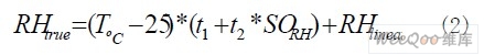 濕度值還和當(dāng)前溫度值相關(guān),因此還要對(duì)其進(jìn)行溫度補(bǔ)償,補(bǔ)償公式如公式(2)所示,各系數(shù)如表2所示。