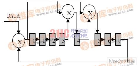 SHT75的CRC值生成算法是根據(jù)SHT75的硬件生成電路來(lái)模擬的,硬件生成電路結(jié)構(gòu)如圖四所示: